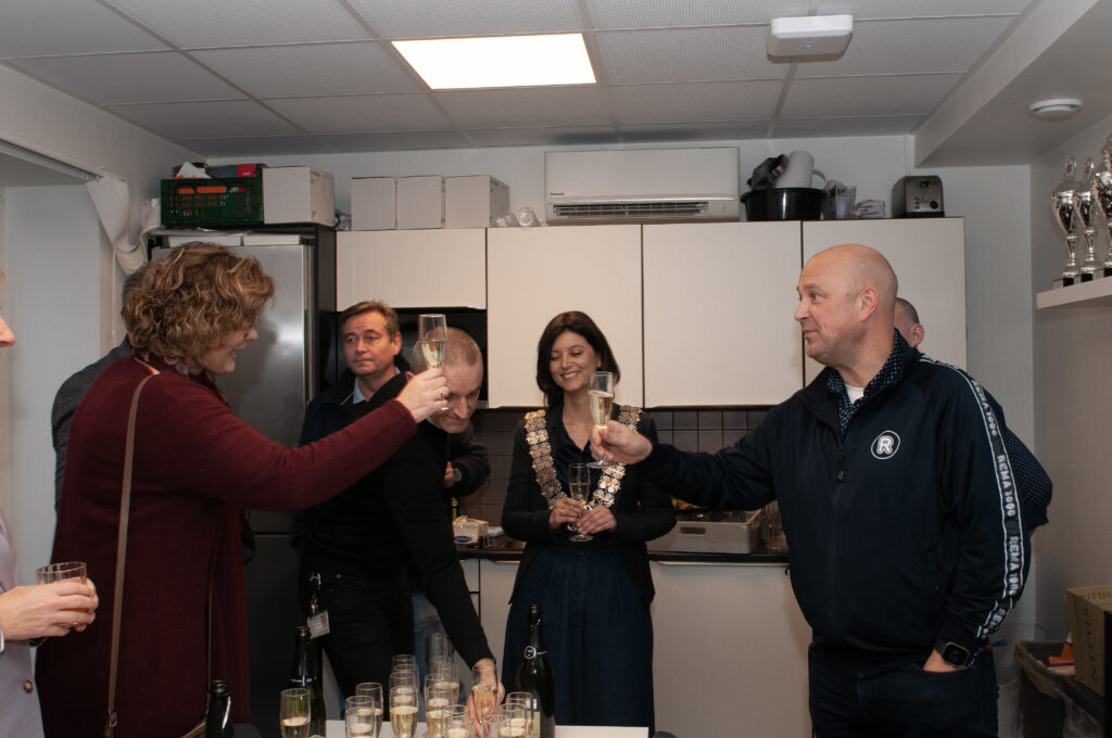 Her holdt borgmester Sofia Osmani, som i dagens anledning var iført den flotte borgmesterkæde, en kort tale, hvori hun nævnte, at man næsten kunne føle sig hjemme her på anden sal, hvor kantinen ligger, og hvor man i forvejen har et større antal pokaler stående, samt en væg, der på det nærmeste er plastret til med diplomer.