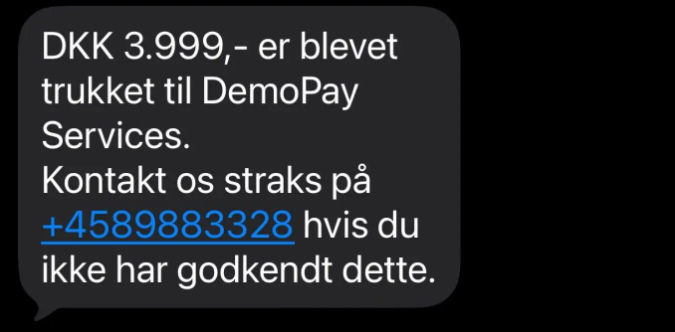 Beskederne udgiver sig for at komme fra firmaer som “DemoPay Services” eller “Alpha Services” og beder modtageren om at ringe til et telefonnummer – typisk med dansk landekode og begyndende med +45 89…