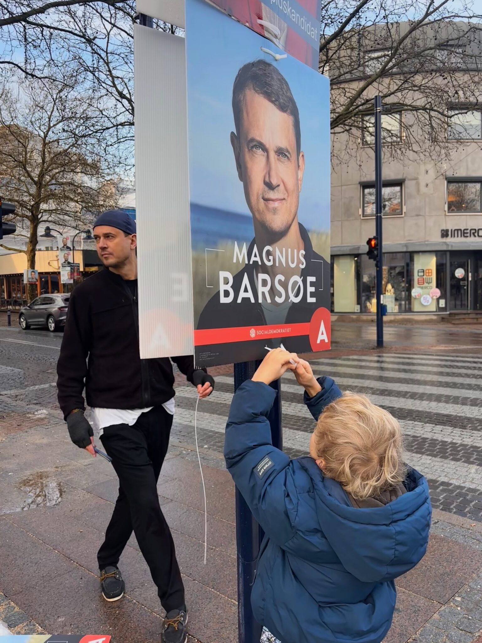 Seksårige Buster hjalp far, Magnus Barsøe, med at hænge valgplakater op i Lyngby Hovedgade.