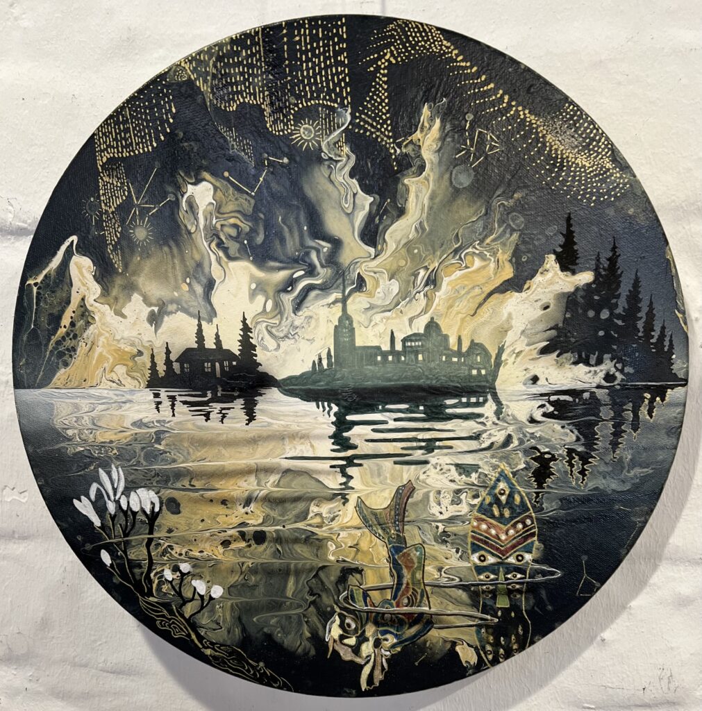 Jonas Pihl bevæger sig i det metaforiske og det kosmiske. Hans malerier er som vinduer ind i et drømmende univers, hvor selvet spejles, foldes ud og undersøges. Med humor, dybde og en eksperimenterende tilgang til farver og form, giver han publikum mulighed for at se sig selv i et nyt lys – måske endda fra flere vinkler på én gang.