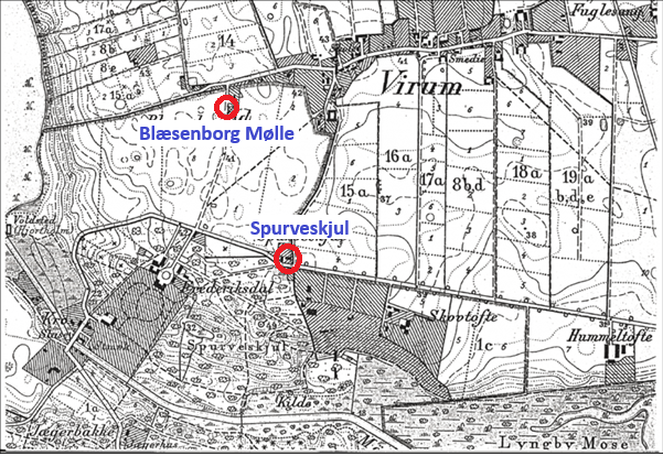 På et samtidigt kort kan man se hvordan ”Spurveskjul” ligger i forhold til møllen og Virum: