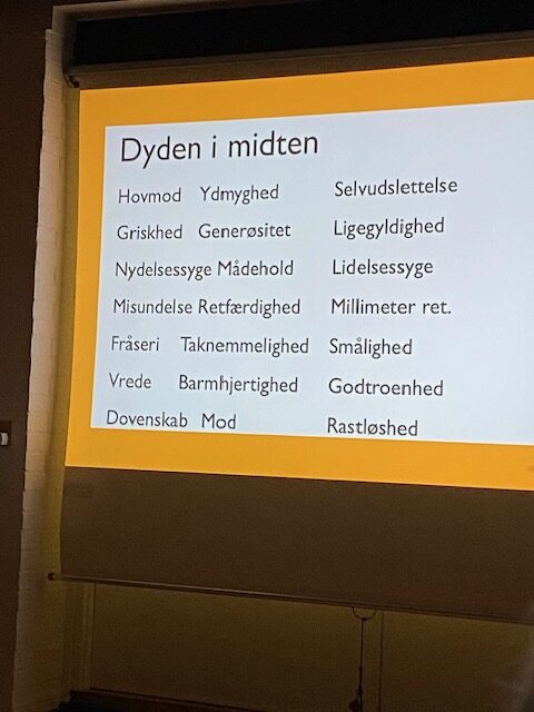 Tilbage til ”dyderne”, så kom det frem, at dyder er et etisk kompas, og at vi lærer dyderne at kende gennem ”opdragelse, uddannelse og rollemodeller, men først og fremmest gennem fortællinger – både store og små.
