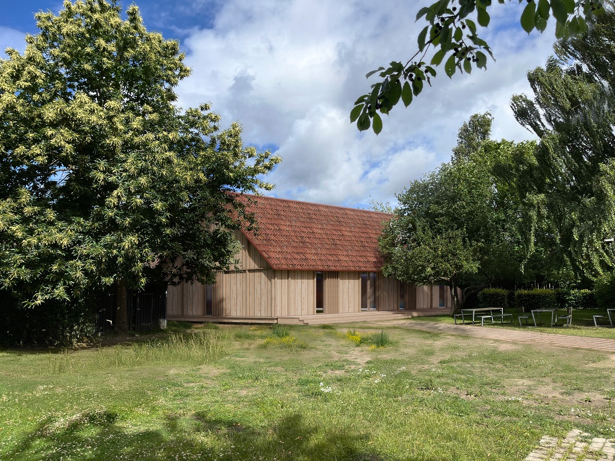 Taget bliver lagt med genanvendte teglsten fra en lokal nedrivning, gulvet består af et genbrugt gymnastikgulv fra Virumhallen, og isoleringen er udført i naturlige, fornybare materialer. Facaden beklædes med træ fra restproduktion i træindustrien, og hele konstruktionen står på skruefundamenter – et klimavenligt alternativ til beton, som reducerer CO₂-udledningen betydeligt.