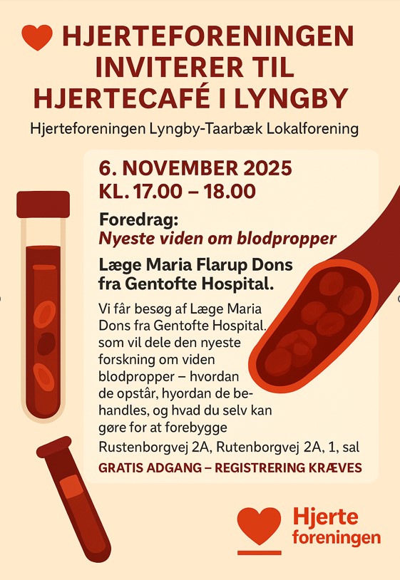 Hjerteforeningen i Lyngby-Taarbæk afholder hjertecafé den 6. november kl. 17.00-18.00 på Rustenborgvej 2A, 1. sal.