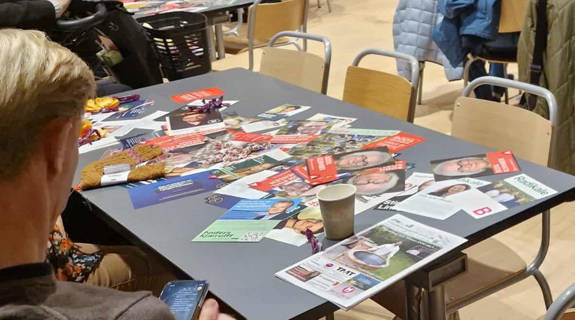 Det viser nogle af de flyers, som politikerne fordelte på bordene forud for valgmødet på Virum Gymnasium.