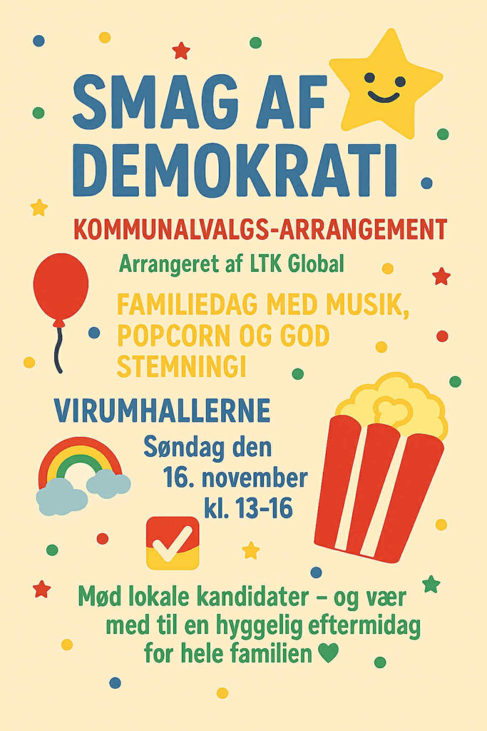 Søndag den 16. november inviterer LTK Global Forening til en eftermiddag fyldt med hygge, samtaler og fællesskab i Virumhallerne. Arrangementet finder sted fra kl. 13.00 til 16.00 og er åbent for alle.