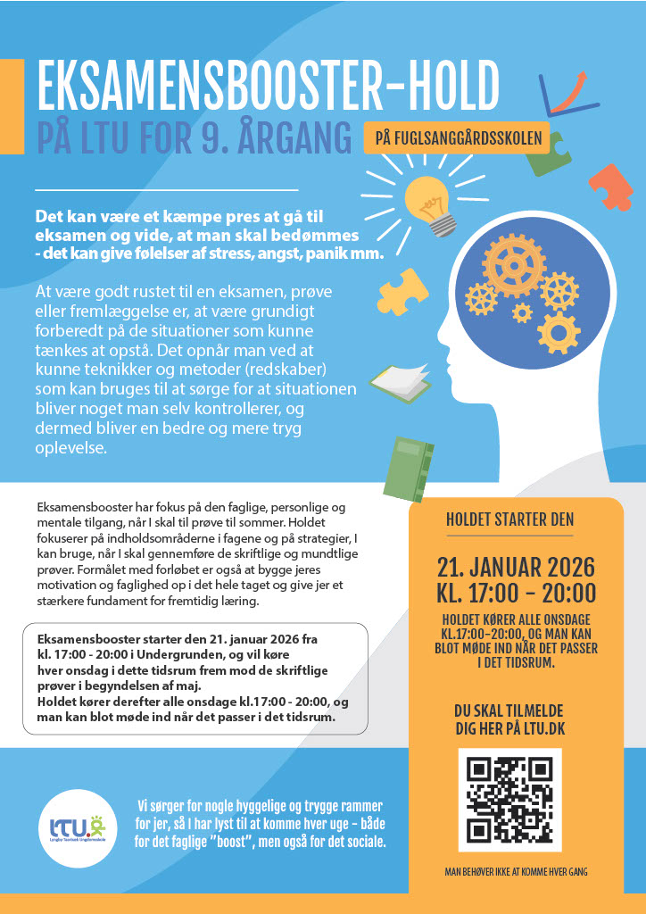 Forløbet starter onsdag den 21. januar 2026 kl. 17:00-20:00 i Undergrunden på Fuglsanggårdsskolen, og vil herefter køre hver onsdag frem til de skriftlige eksamener.