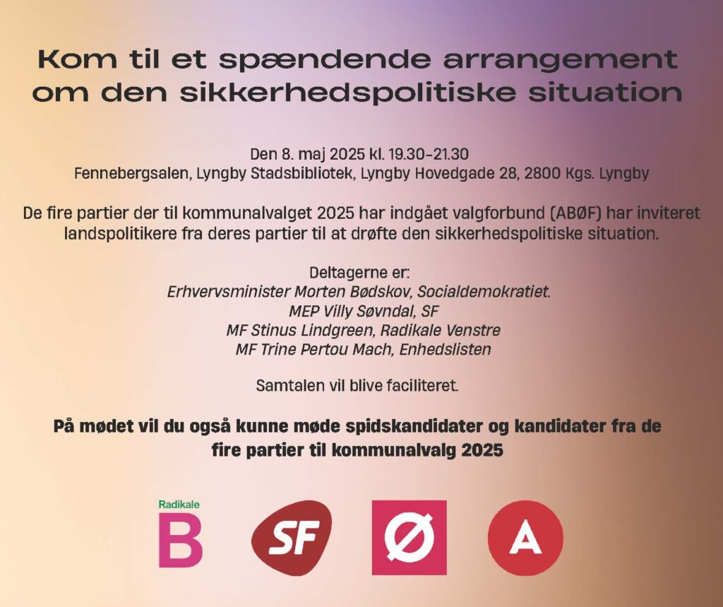 Derfor indkalder Socialistisk Folkeparti, Socialdemokratiet, de Radikale og Enhedslisten til et spændende arrangement om den sikkerhedspolitiske situation, den 8. maj 2025 kl. 19.30-21.30 i Fennebergsalen, Lyngby Stadsbibliotek, Lyngby Hovedgade 28, 2800 Kgs. Lyngby