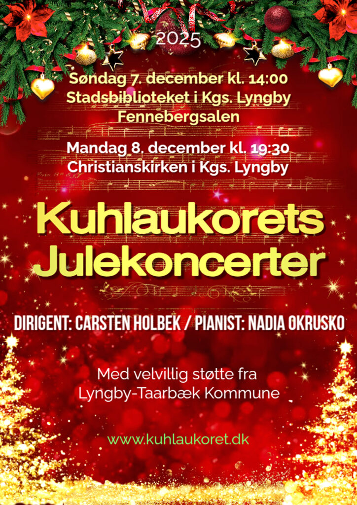 Første koncert finder sted i Fennebergsalen på Stadsbiblioteket i Kgs. Lyngby, Lyngby Hovedgade 28. Her præsenterer Kuhlaukoret et varieret program med værker af blandt andre Edward Elgar, Franz Gruber, Amanda McBroom og Michael Bojesen. Nadia Okrusko medvirker både som akkompagnatør og solist. Publikum inviteres til at synge med på udvalgte fællessange og salmer – en tradition, der er med til at gøre koncerten ekstra nærværende og hyggelig.