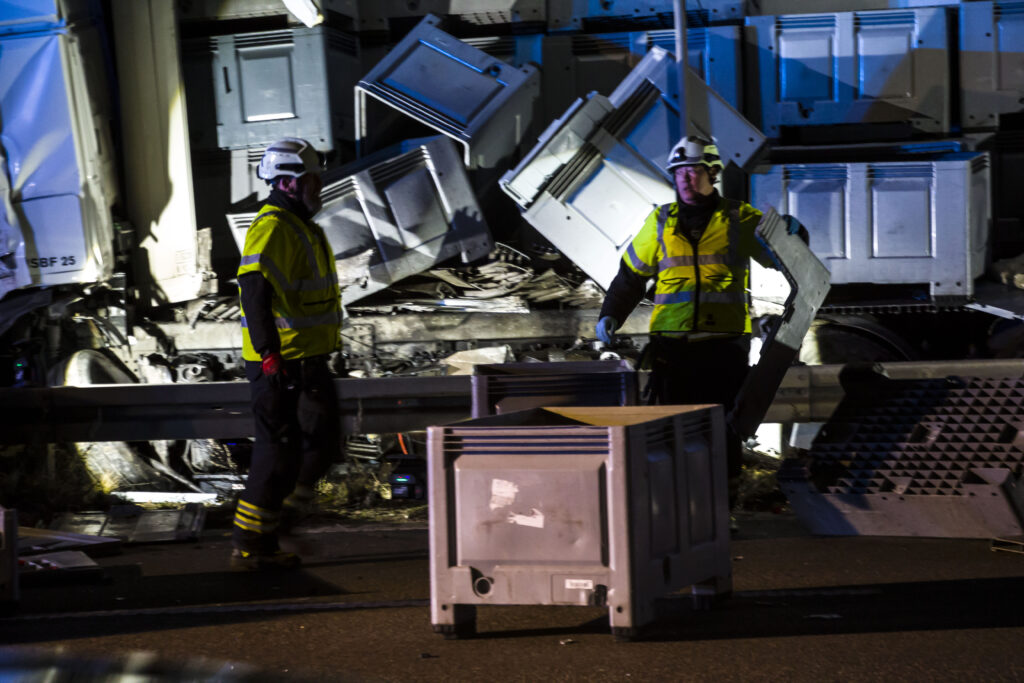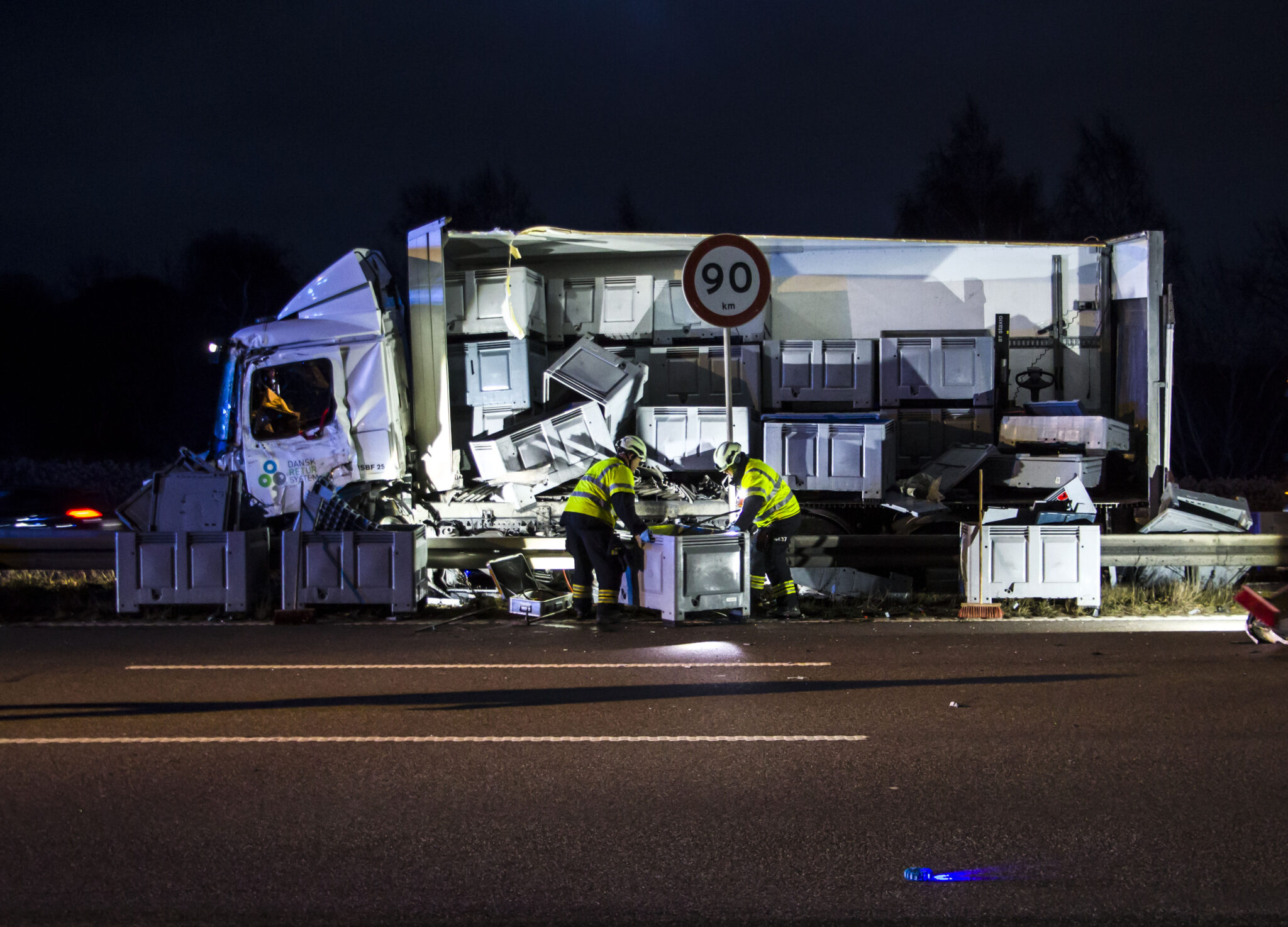 Lastbilen kørte ind i midterrabatten, hvor hele siden af køretøjet blev flået op. Dele fra lastbilen ramte efterfølgende biler i sydgående retning.