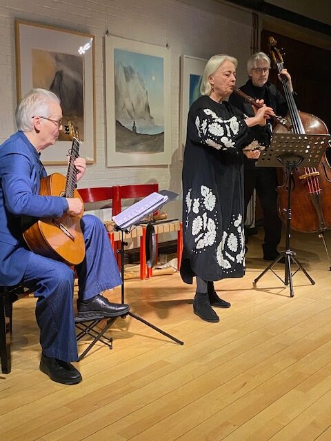 I centrum var Michala Petri – Danmarks internationalt anerkendte blokfløjtenist – omgivet af Lars Hannibal på guitar og lut samt Frank Reinecke på kontrabas.