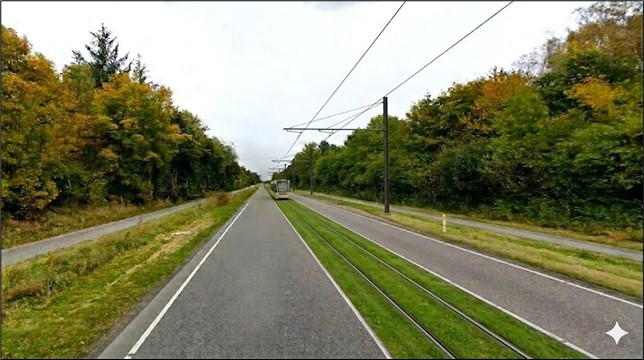 Med en frekvens på 10 minutter vil letbanen kunne nøjes med kun et spor det meste af vejen. Nedfor har jeg ved hjælp af AI prøvet at illustrere, hvordan det vil se ud. Jeg er ikke ekspert i AI, og derfor er billedet ikke helt retvisende. Letbanearealet i midten vil blive lidt bredere, og til gengæld bliver man nødt til at lave det grønne areal i siderne tilsvarende smallere. Man vil for øvrigt kunne undlade master og overledning ved at lade letbanen køre på batteri eller supercapacitorer.