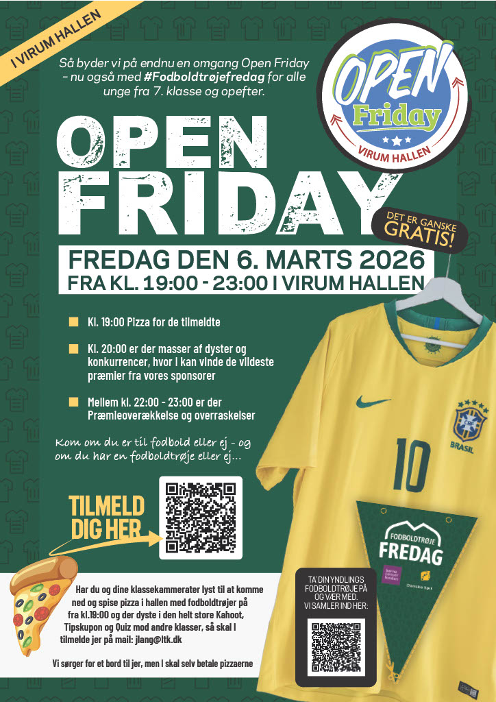 Fredag den 6. marts 2026 kl. 19.00–23.00 inviterer LTU, Ungdomsskolen, SSP og Forældrenetværket til en særlig Open Friday i Virum Hallen. Aftenen afholdes i forbindelse med #Fodboldtrøjefredag og henvender sig til unge fra 7. klasse og opefter.