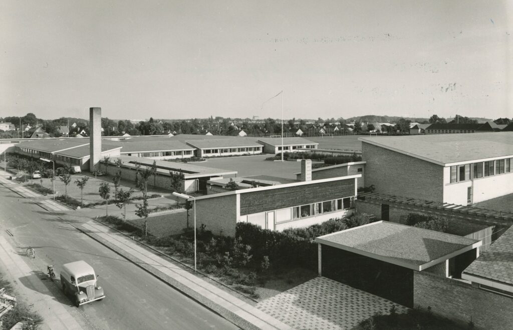 Fuglsanggårdsskolen, Askevænget 6-10 i Virum. Projekteret af arkitekterne Chr., Erik og Aage Holst. Indviet 1959, præmieret (i form af ‘anerkendelse’) af Lyngby-Taarbæk Kommune 1960.