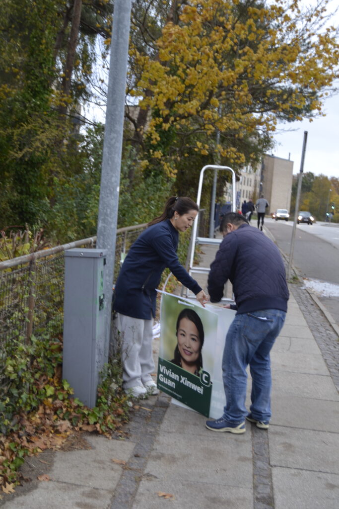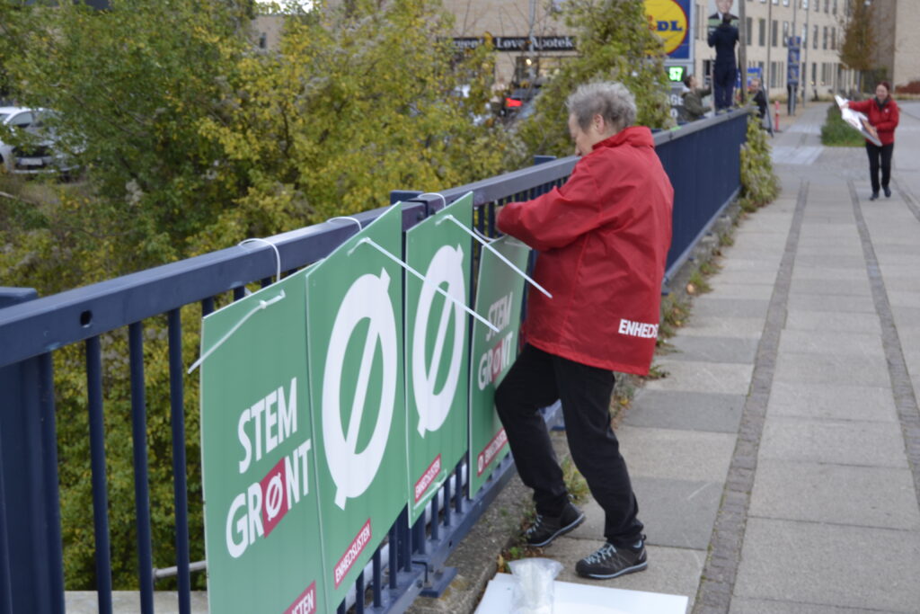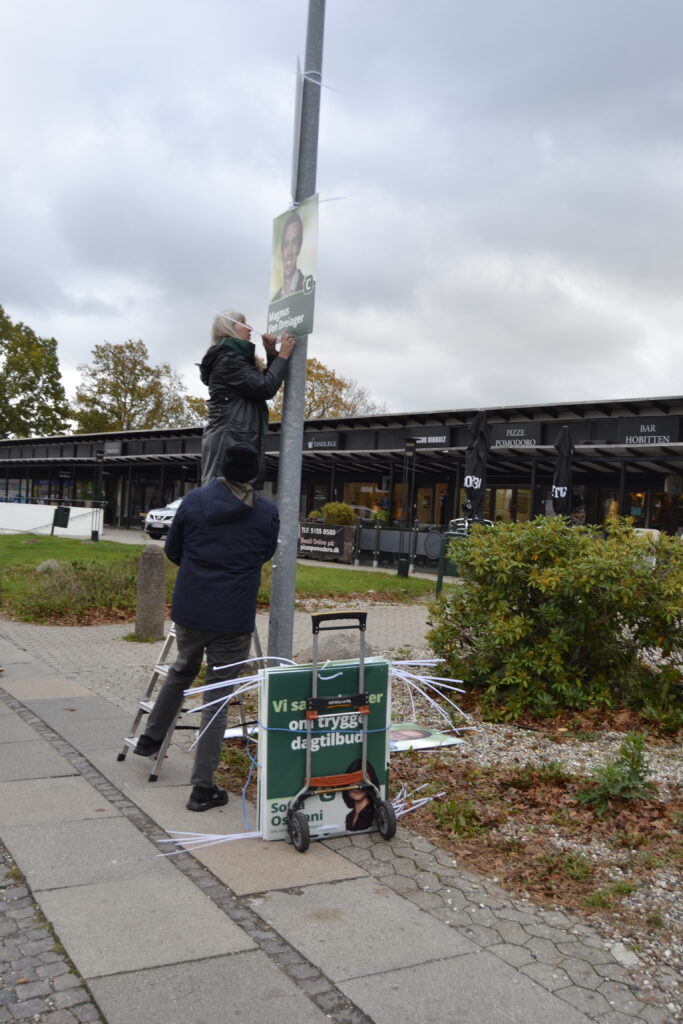 Klokken 11.45 var der fredeligt. Ikke et eneste spor af, hvad der var i vente. Men præcis kl. 12 skete det. Som om nogen havde trykket på en usynlig kontakt – eller åbnet en æske med aktivitet og ambition – blev Grønnevej og Hummeltoftevej forvandlet. Stiger blev stillet op. Snore, strips og systematiske metoder blev taget i brug. Plakaterne skulle op – og de skulle højt op. Ifølge reglerne skal de hænge minimum 2,3 meter over jorden.