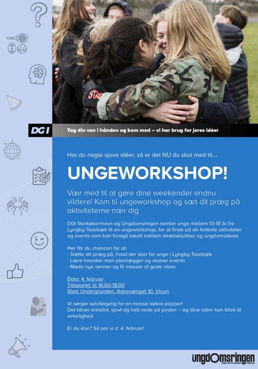 Er du mellem 13 og 18 år, fuld af gode idéer og klar til at gøre dine weekender endnu sjovere? Så må du ikke gå glip af Ungeworkshoppen arrangeret af DGI Storkøbenhavn og Ungdomsringen i samarbejde med LTU/Ungdomsskolen.