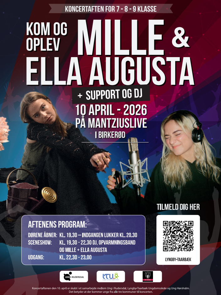 Er du ung fra 7. klasse og opefter, og klar på en aften fyldt med musik, fællesskab og fede vibes? Så skal du med til årets ungdomskoncert på MantziusLive i Birkerød – en dobbeltkoncert med Mille og Ella Augusta!